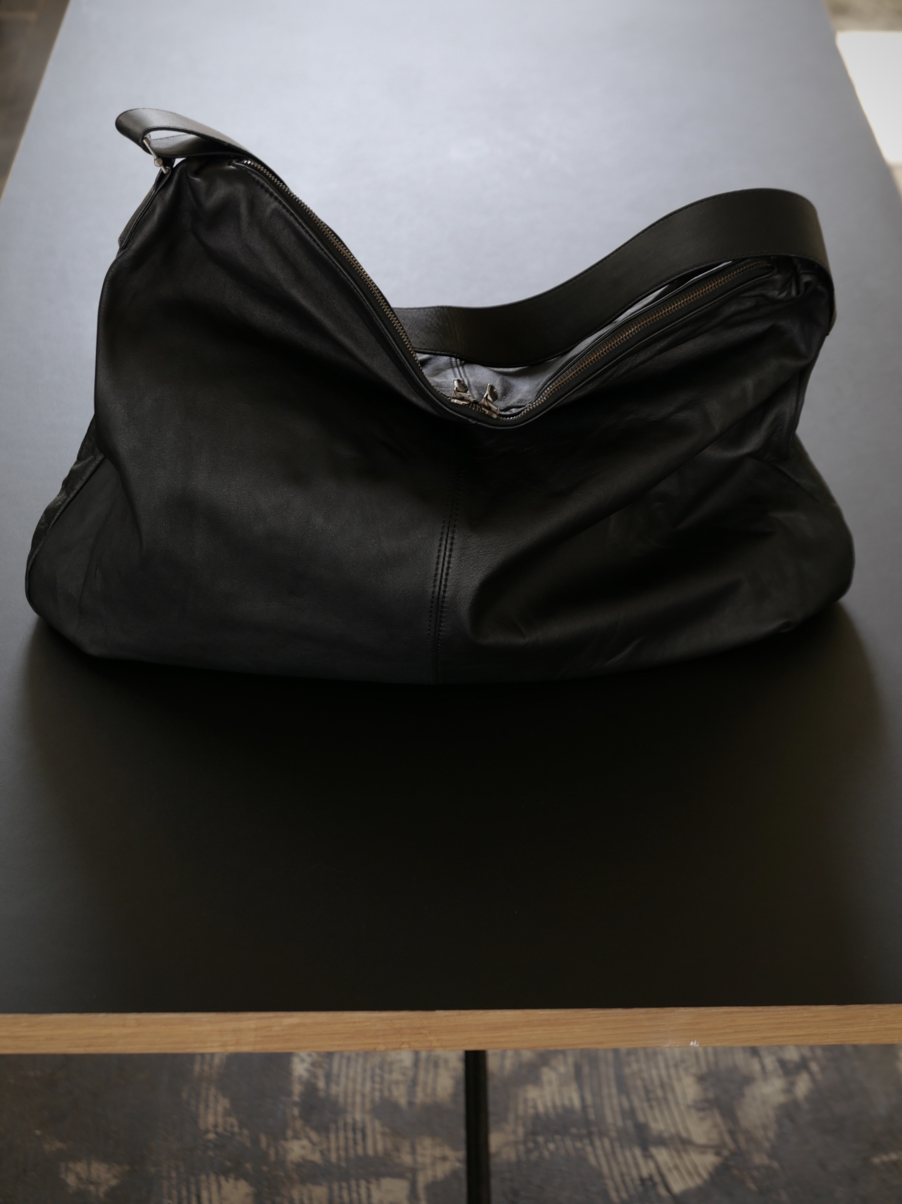 A leather bag distinguished by its naturally developed texture shaped through silhouette and process